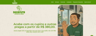 A identidade visual usa tons de verde e fundo claro para transmitir cuidado com o meio ambiente, saúde e leveza. A tipografia arredondada e a ilustração do profissional deixam a comunicação amigável e próxima, reforçando a conexão entre proteção contra pragas e responsabilidade ambiental.