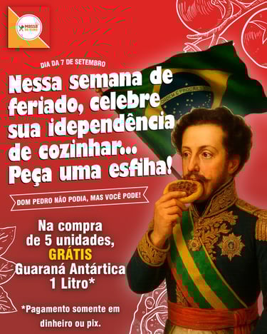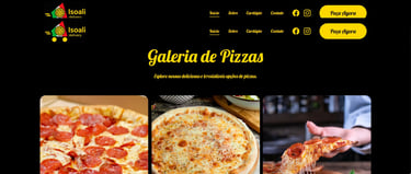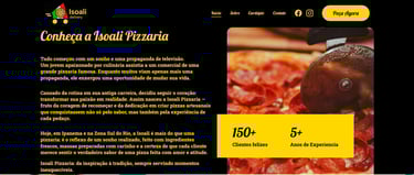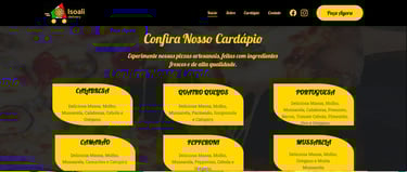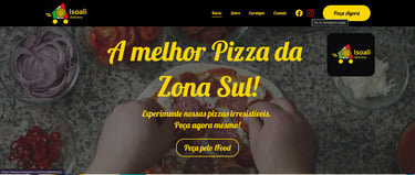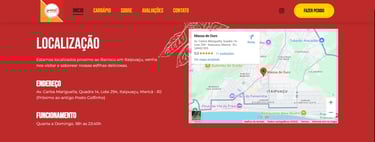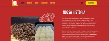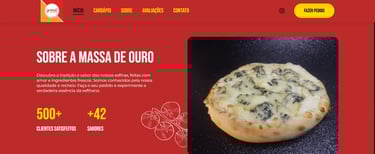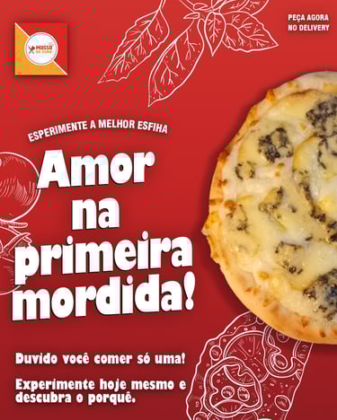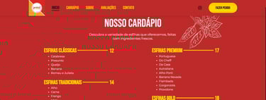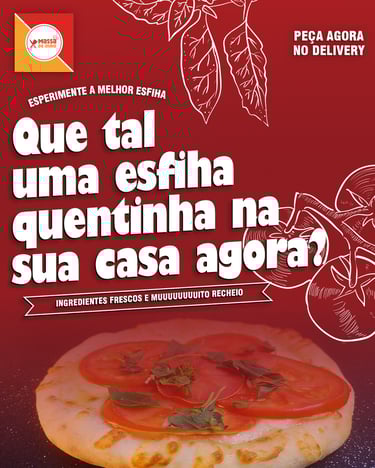 A identidade visual aqui é bem forte e chamativa, com vermelho e amarelo que passam energia e apetite. O texto direto e em destaque prende a atenção, enquanto a imagem da esfiha no forno reforça o sabor e a autenticidade. Os botões de ação ficam claros e convidativos, deixando tudo com um tom mais impactante e voltado pra fazer o cliente pedir na hora.
